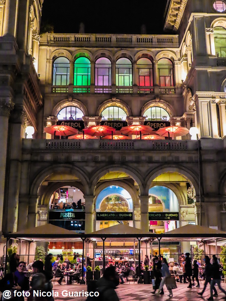 Di sera, Piazza Diaz sembra una colata di acciaio scintillante. Si trova di fianco al Duomo. |