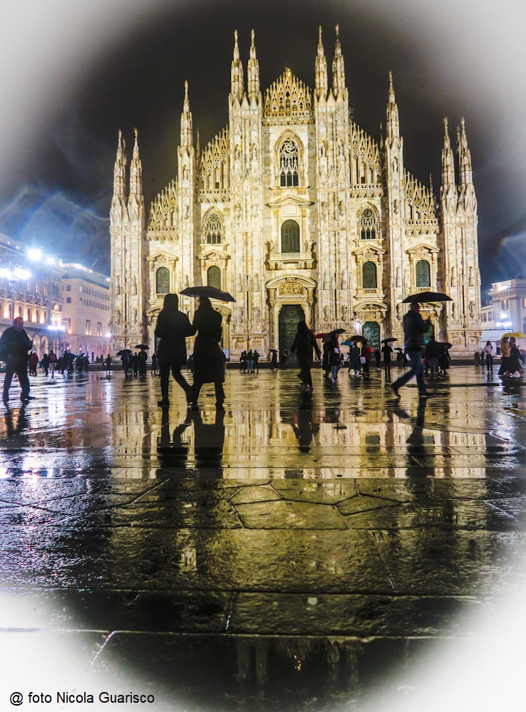 A blend of warm colors ranging from the yellow nuances of the autumn leaves to the bright red hues of the building facades, typical of ancient Milanese architecture and the Medieval style from which the Velasca tower draws inspiration. Right: The portico of Ca' Granda. |